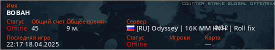 Играет на Counter Strike Global Offensive сервере. Страна: РоссияПервый раз замечен 17:09 18.04.2025
