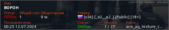 Играет на Counter Strike Source сервере. Страна: РоссияПервый раз замечен 18:20 12.05.2024