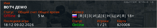 Играет на Counter Strike 1.6 сервере. Страна: РоссияПервый раз замечен 18:01 09.02.2026