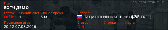 Играет на Counter Strike 1.6 сервере. Страна: РоссияПервый раз замечен 20:33 07.03.2026