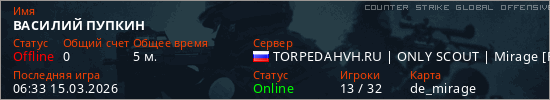 Играет на Counter Strike Global Offensive сервере. Страна: РоссияПервый раз замечен 06:26 15.03.2026