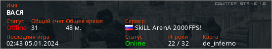 Играет на Counter Strike 1.6 сервере. Страна: РоссияПервый раз замечен 17:07 06.02.2023
