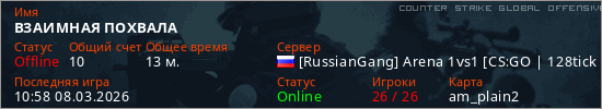 Играет на Counter Strike Global Offensive сервере. Страна: РоссияПервый раз замечен 21:57 07.03.2026