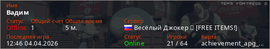 Играет на Team Fortress 2 сервере. Страна: РоссияПервый раз замечен 11:56 04.04.2026