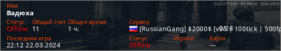 Играет на Counter Strike Source сервере. Страна: РоссияПервый раз замечен 21:06 28.08.2023