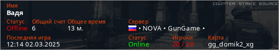 Играет на Counter Strike Source сервере. Страна: РоссияПервый раз замечен 05:09 02.03.2025