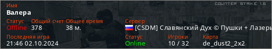 Играет на Counter Strike 1.6 сервере. Страна: РоссияПервый раз замечен 21:14 14.09.2024