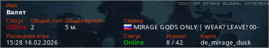Играет на Counter Strike Global Offensive сервере. Страна: РоссияПервый раз замечен 15:20 16.02.2026