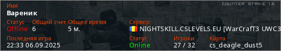 Последний раз был в сети 22:33 06.09.2025 Игрок с таким ником замечен на 11 серверах