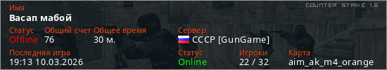 Играет на Counter Strike 1.6 сервере. Страна: РоссияПервый раз замечен 20:20 14.02.2026