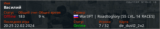 Играет на Counter Strike 1.6 сервере. Страна: РоссияПервый раз замечен 13:57 07.02.2021
