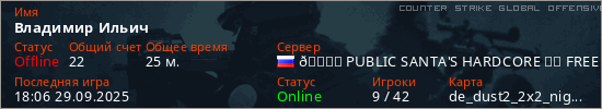 Играет на Counter Strike Global Offensive сервере. Страна: РоссияПервый раз замечен 19:29 27.09.2025