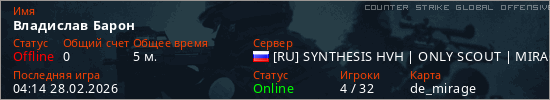 Играет на Counter Strike Global Offensive сервере. Страна: РоссияПервый раз замечен 04:07 28.02.2026