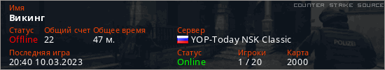 Играет на Counter Strike Source сервере. Страна: РоссияПервый раз замечен 21:16 09.03.2023