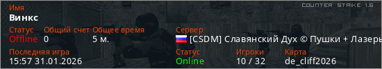 Играет на Counter Strike 1.6 сервере. Страна: РоссияПервый раз замечен 15:51 31.01.2026