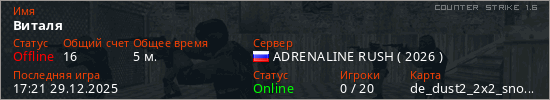 Играет на Counter Strike 1.6 сервере. Страна: РоссияПервый раз замечен 17:11 29.12.2025