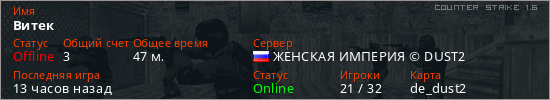 Играет на Counter Strike 1.6 сервере. Страна: РоссияПервый раз замечен 09:27 23.02.2026