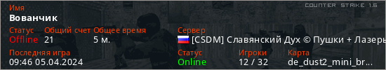 Играет на Counter Strike 1.6 сервере. Страна: РоссияПервый раз замечен 09:44 05.04.2024