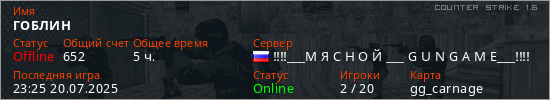 Играет на Counter Strike 1.6 сервере. Страна: РоссияПервый раз замечен 12:14 22.07.2022