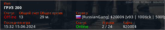 Играет на Counter Strike Source сервере. Страна: РоссияПервый раз замечен 20:55 28.05.2024