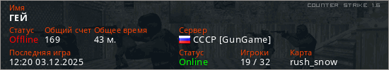 Играет на Counter Strike 1.6 сервере. Страна: РоссияПервый раз замечен 08:36 12.11.2025