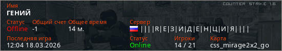 Играет на Counter Strike 1.6 сервере. Страна: РоссияПервый раз замечен 17:16 17.03.2026