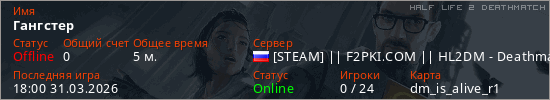 Играет на Half Life 2 DeathMatch сервере. Страна: РоссияПервый раз замечен 17:58 31.03.2026