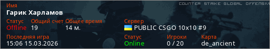Играет на Counter Strike Global Offensive сервере. Страна: УкраинаПервый раз замечен 18:07 12.03.2026
