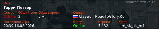 Играет на Counter Strike 1.6 сервере. Страна: РоссияПервый раз замечен 20:29 16.02.2026