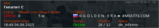 Играет на Counter Strike 1.6 сервере. Страна: РоссияПервый раз замечен 18:42 06.06.2025