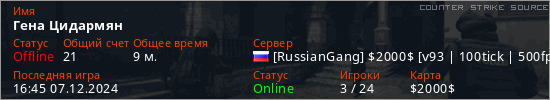 Играет на Counter Strike Source сервере. Страна: РоссияПервый раз замечен 15:07 07.12.2024