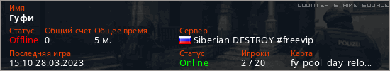 Играет на Counter Strike Source сервере. Страна: РоссияПервый раз замечен 15:06 28.03.2023