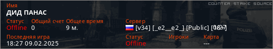 Играет на Counter Strike Source сервере. Страна: РоссияПервый раз замечен 17:07 09.02.2025