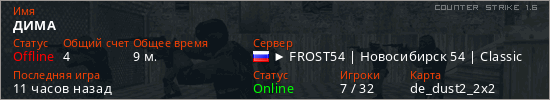 Играет на Counter Strike 1.6 сервере. Страна: РоссияПервый раз замечен 21:03 09.04.2026