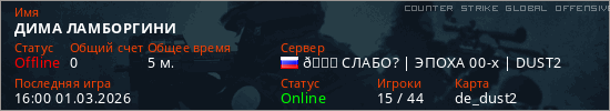 Играет на Counter Strike Global Offensive сервере. Страна: РоссияПервый раз замечен 15:57 01.03.2026