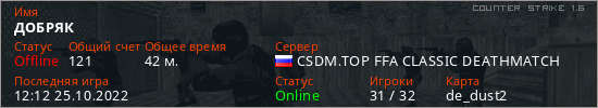 Играет на Counter Strike 1.6 сервере. Страна: РоссияПервый раз замечен 11:32 25.10.2022