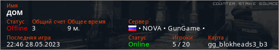 Играет на Counter Strike Source сервере. Страна: РоссияПервый раз замечен 07:18 17.03.2023