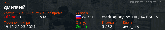 Играет на Counter Strike 1.6 сервере. Страна: РоссияПервый раз замечен 19:09 25.03.2024