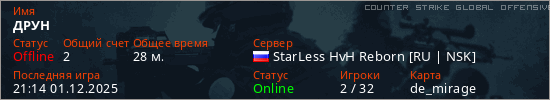 Играет на Counter Strike Global Offensive сервере. Страна: РоссияПервый раз замечен 18:38 11.10.2025