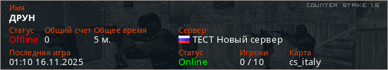 Играет на Counter Strike 1.6 сервере. Страна: РоссияПервый раз замечен 01:04 16.11.2025