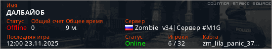 Играет на Counter Strike Source сервере. Страна: РоссияПервый раз замечен 11:06 23.11.2025