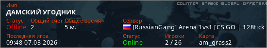 Играет на Counter Strike Global Offensive сервере. Страна: РоссияПервый раз замечен 08:59 07.03.2026