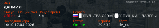 Играет на Counter Strike 1.6 сервере. Страна: РоссияПервый раз замечен 14:06 17.04.2026
