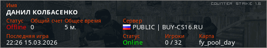 Играет на Counter Strike 1.6 сервере. Страна: РоссияПервый раз замечен 22:18 15.03.2026