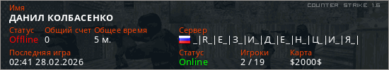 Играет на Counter Strike 1.6 сервере. Страна: РоссияПервый раз замечен 02:38 28.02.2026