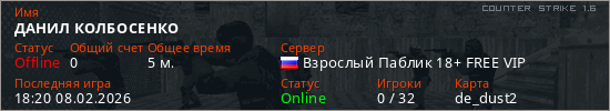 Играет на Counter Strike 1.6 сервере. Страна: РоссияПервый раз замечен 18:07 08.02.2026