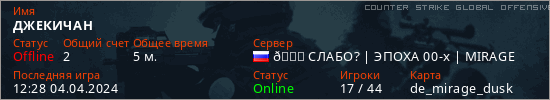 Играет на Counter Strike Global Offensive сервере. Страна: РоссияПервый раз замечен 12:22 04.04.2024