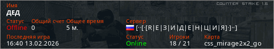 Играет на Counter Strike 1.6 сервере. Страна: РоссияПервый раз замечен 16:36 13.02.2026