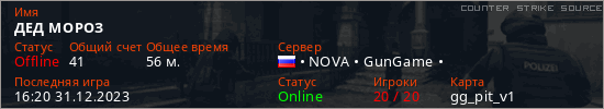 Играет на Counter Strike Source сервере. Страна: РоссияПервый раз замечен 16:16 29.12.2022
