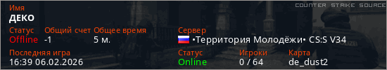 Играет на Counter Strike Source сервере. Страна: РоссияПервый раз замечен 16:28 06.02.2026